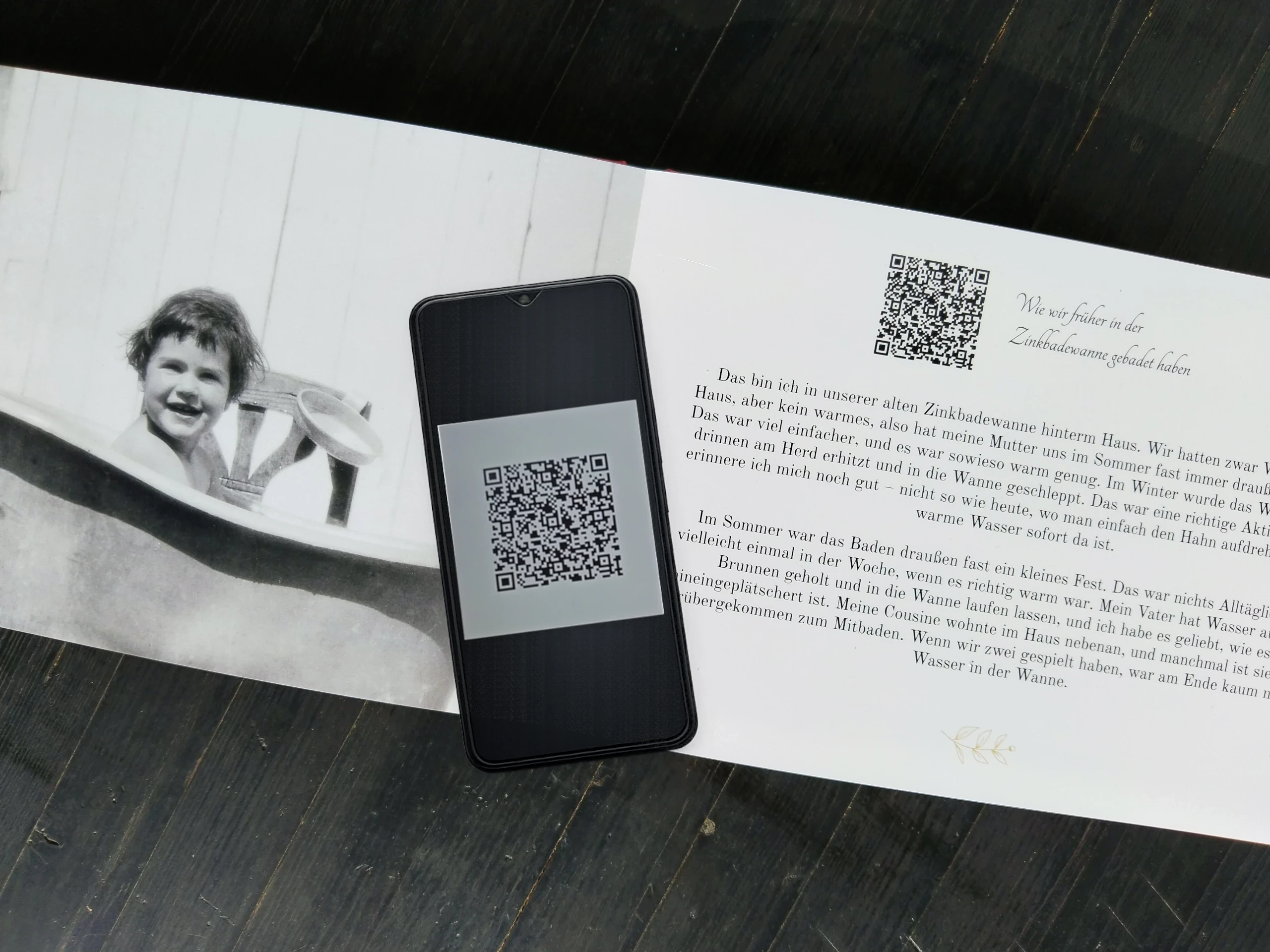 Wenn Ihr Paket ein Familieninterview umfasst, erhalten Sie ein Vorbereitungspaket mit ausgewählten Themen und Leitfragen. Das Interview führen wir per Zoom oder telefonisch durch. Aus dem Gespräch wählen wir passende Audioausschnitte aus und integrieren sie als QR-Codes ins Album. Alternativ können Sie das Gespräch auch selbst aufnehmen.